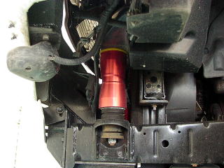 前輪ホイールハウス内をのぞいたところです 赤い6インチのアジャスター計8箇所でリフトア ップしてます(@_@。 で、さ・ら・に・・・ |