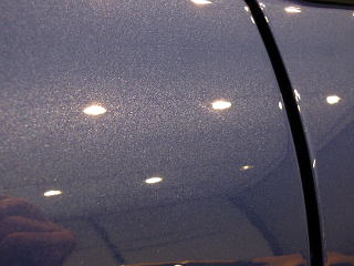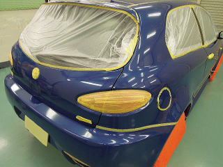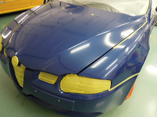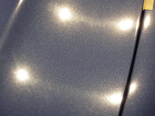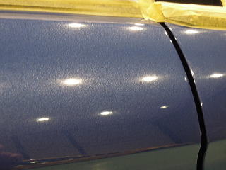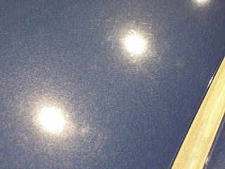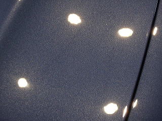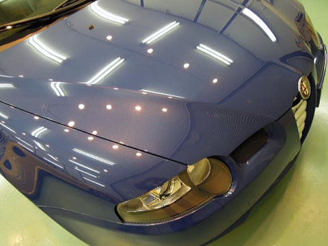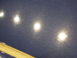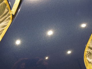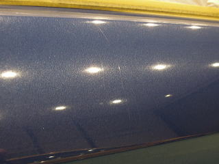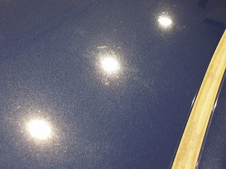 ![]() 洗車・鉄粉除去後各部をキッチリとマスキングし下地磨き開始 塗装の状態は、ボンネットとルーフ、特にルーフは重度の雨染みと 水あかや何かのコート剤かシャンプーのようなものが重なり合い、本来の色がぼやけうっすらと白くなってしまっています サイド面は雨染みや洗車傷は少ないですが、細かな点々としたおそらくシャンプー染みが無数に存在します |