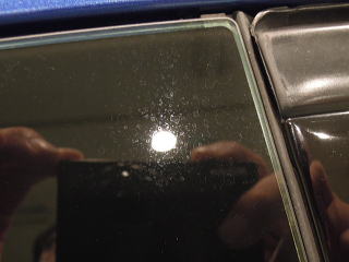 ![]() キワやカドの雨染みは取り除き難いのですが 窓枠ギリギリのラインまで丹念に除去いたします 当然、塗られている撥水剤も除去することとなりますので 磨き後、新たに「ハイパービュー」にて撥水加工を施します |