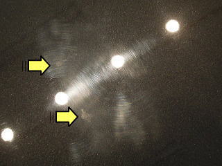 ![]() Fバンパーの激しい機械磨きキズ 手前が前面で後方が上面 |