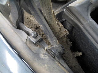 ![]() ボンネットのヒンジ部分の汚れ 土埃が泥状になって固まってます |
