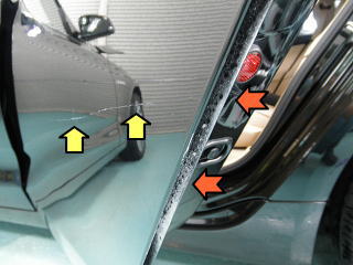 ![]() 左リアドアを開けた状態 オーナーさまの気にされていた約50センチの長い傷 (黄矢印)と、ドア隙間に残された多量のコンパウンドのカス (オレンジ矢印) |