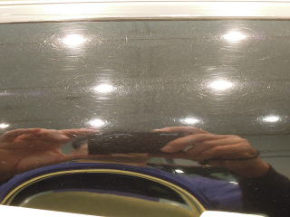 ![]() リアフェンダー上部 洗車傷+水あかにより白く曇った状態 |
