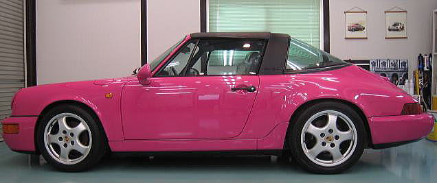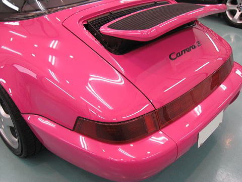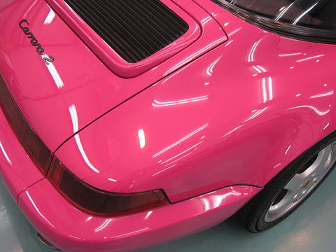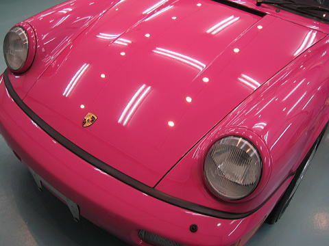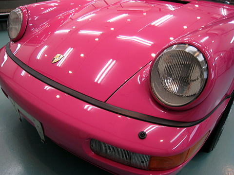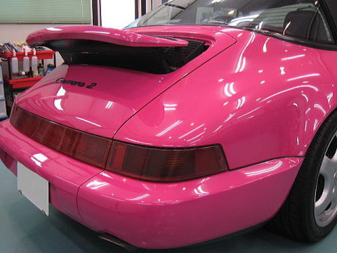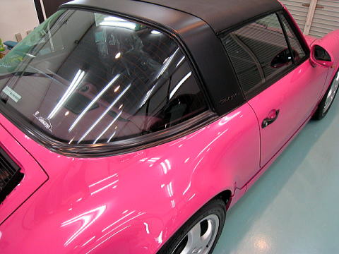 この後、再洗車、エアーによる水切り、乾燥、ボディガラスコーティング、 窓ガラス撥水処理、タルガトップ&Cピラー保護コーティング、室内清掃、細部処理と続きます |
