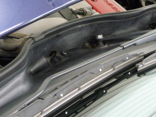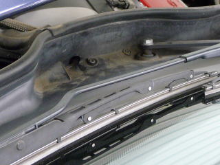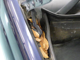 ![]() ボンネットを開けてみると・・・ 水の流れる部分に奥まで枯葉がぎっしり 手でかき出して、さらにエアーで奥のものを吹き飛ばします |