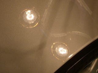 ![]() シャンプー洗車直後、濡れた状態のボンネット 向かって左前方にかけて、洗車だけでは落ちないうっすらと茶色かかった水あかが見て取れます 所々、丸くムラになっていますね |
