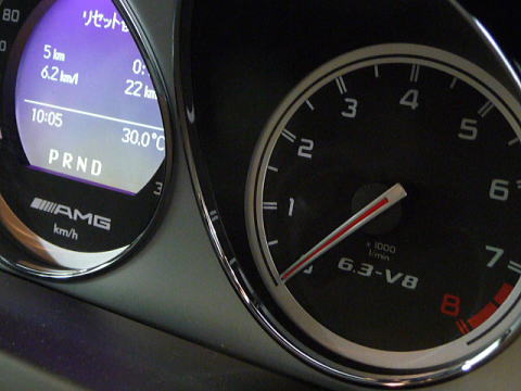 ![]() エンジン製作担当者の名前が刻まれた四角いプレートが中央に鎮座する6.3リッターV8エンジン ![]() 極太&フラットボトムのハンドルが素性を予感させます ![]() メーター内の小さな「AMG」 「6.3-V8」のロゴににんまり |