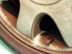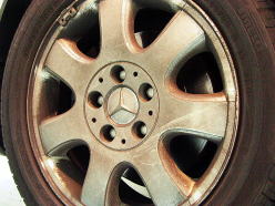 ホイール全体がブレーキダストやほこり等に より茶色くなってます。ホールの部分の汚れ は強烈です!ちょっとやそっとこすっただけ では除去できません。 除去してみると、スポーク表面はシルバー 塗装、 リム部と7穴の内側は切磋タイプの おしゃれなホイールでした(^_^) |