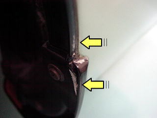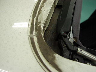 ![]() 砂・汚れ・鉄粉を取り除いた状態です バイザーゴム部と接触していた部分にキズが入り 黄ばんでいます。磨きでも若干残ってしまうかも。 |