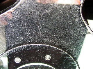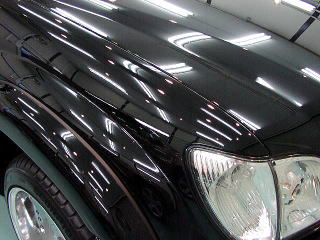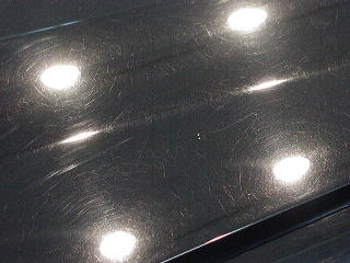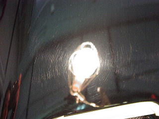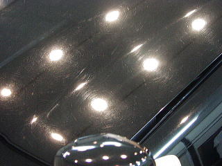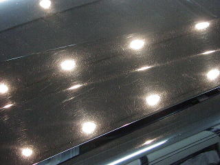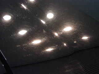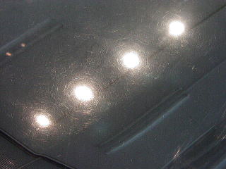 ↓ボンネットの様子 曇りの日や蛍光灯の下では見えなくとも、実は雨染みと洗車キズの嵐なんですっ! |