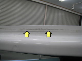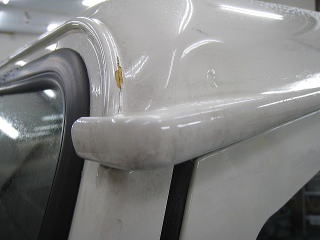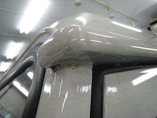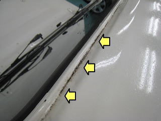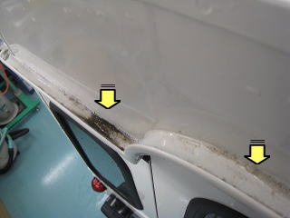 ![]() ルーフ前端右角 黄色い部分は塗装の剥がれでその上下に亀裂 |