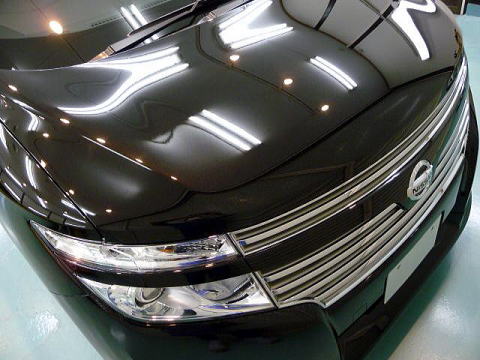 このクラスになると洗車も大変なのですが、さらに厄介なのが洗車後の水切りです 下地磨きやコーティングを施す場合には、水気は大敵 エアーにて徹底的に水分を払いのけるのですが、それでもスライドドアのレール部や テールライト下などからいつまでたっても水がタラタラ、ツぅ〜〜っと流れ出てきます 水が切れたのを見極めて全面下地磨きを行い、もう一度洗車・水切りを完璧に行ってから いよいよコーティングに入ります このお車の塗装は、最近、ニッサンの上級車種に多い「スクラッチシールド」塗装です この塗装には、D−PROから発売されました傷自動復元塗装専用コートの「Type−RC」で決まり! 下地磨き後、再洗車、徹底した水切り&乾燥、 室内温度20度以上でのボディコーティング、 ホイールコート、室内清掃、細部処理と続きます |