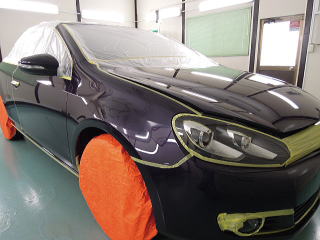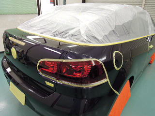 ![]() 洗車、水切り後、ソフトトップの乾燥を待ってマスキング、続いて下地加工に入ります |