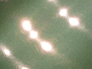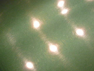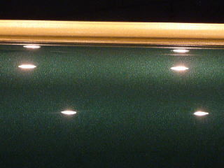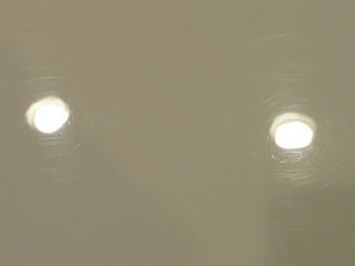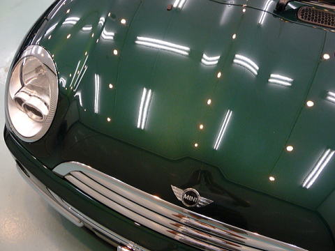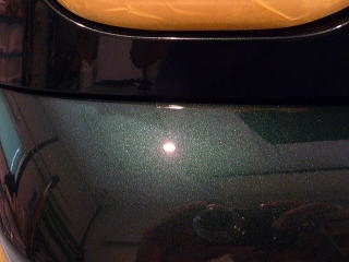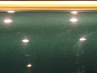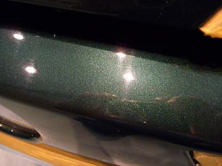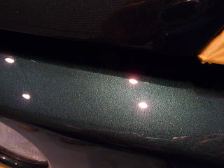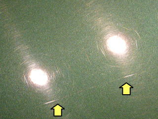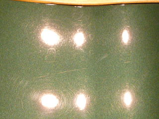 次に塗装面の状態を見ていきますと、洗車傷は、かなり多めのようです オーナーさまが気にされていた矢印部のような深く長い直線的なスクラッチ傷の他にも渦巻き状の洗車傷がご覧のとおり こういう場所で見ると傷だらけの状態をハッキリと確認していただけると思います 洗車傷や雨染みによって、うっすらと白ぼけたブリティッシュグリーンとなってしまっています |