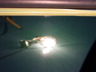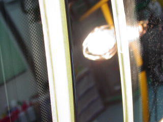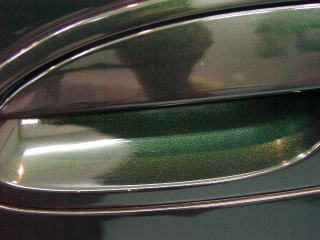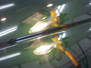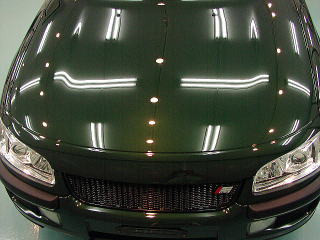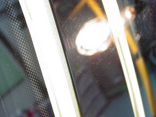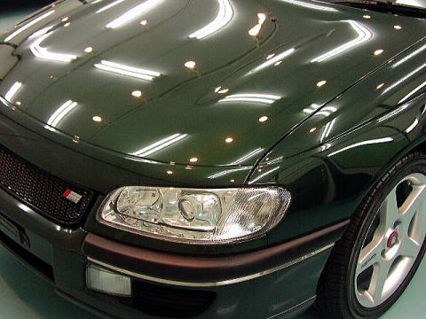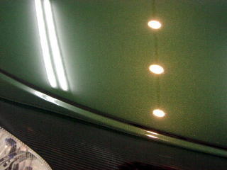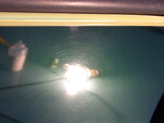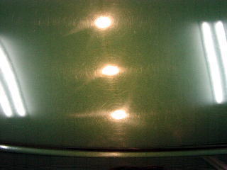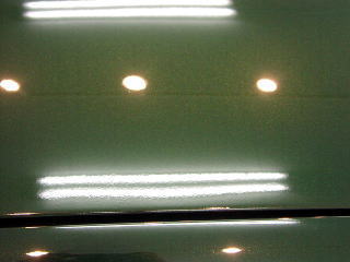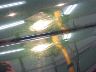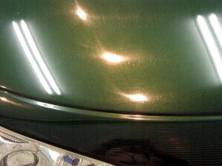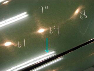 ![]() ボンネット左端は極端に薄くなってますよ! 矢印の蛍光灯の写り方を見れば塗装の荒れが分かります きっと、以前の磨きでこの荒れをならそうと不用意に ゴシゴシ磨いたのでしょう こういう薄くなった部分を知らずにいい気になって磨くと 必ず下地が出てしまいます、注意、注意 |