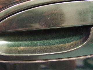 ![]() ドアノブも傷多し、このままではせっかくすっきりした 磨き面も生かされません |