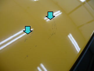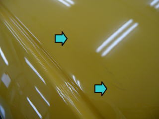 ![]() 塗装保護用フィルムの糊のあと もちろん下地処理にて除去いたします ルーフ先端 |