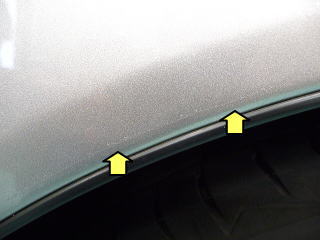 ![]() オーナーさまが気にされていた左リアフェンダーの アーチ状に白く見える部分ですが、 どうやら傷ではなく、塗装自体の問題のようです |