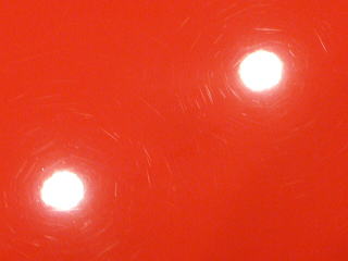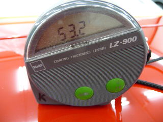 ![]() オーナーさまが言われていたトランクは 塗装が極端に薄いです 画像の膜厚計は53.2ミクロンを示しています (このお車のオリジナル塗装は90ミクロン前後) |