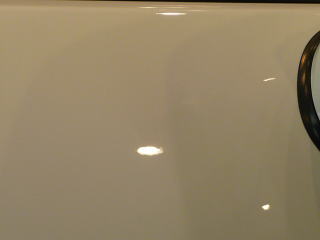 鉄粉が大目の塗装面ですが、洗車傷も多く見て取れます 白という特性上、画像ですと直感的に傷と認識しにくいのですが 艶感に乏しく、ライトの映り込み、輪郭がバサバサ、ボソボソっとしていることで間接的に判断できると思います |