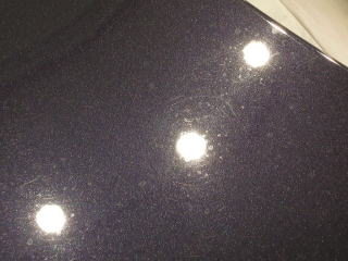 塗装の状態としましては、 ボンネットとルーフを中心に中程度の洗車傷と軽度の雨染みが見られるほか 以前のものと思われる磨き傷が所々に見られます また、ノーズ周りやリアスポイラーなどの樹脂塗装部の曇りも気になるところです |