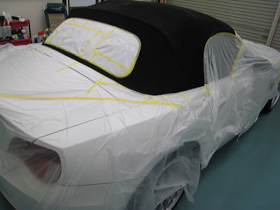 ![]() 幌の撥水処理中 |